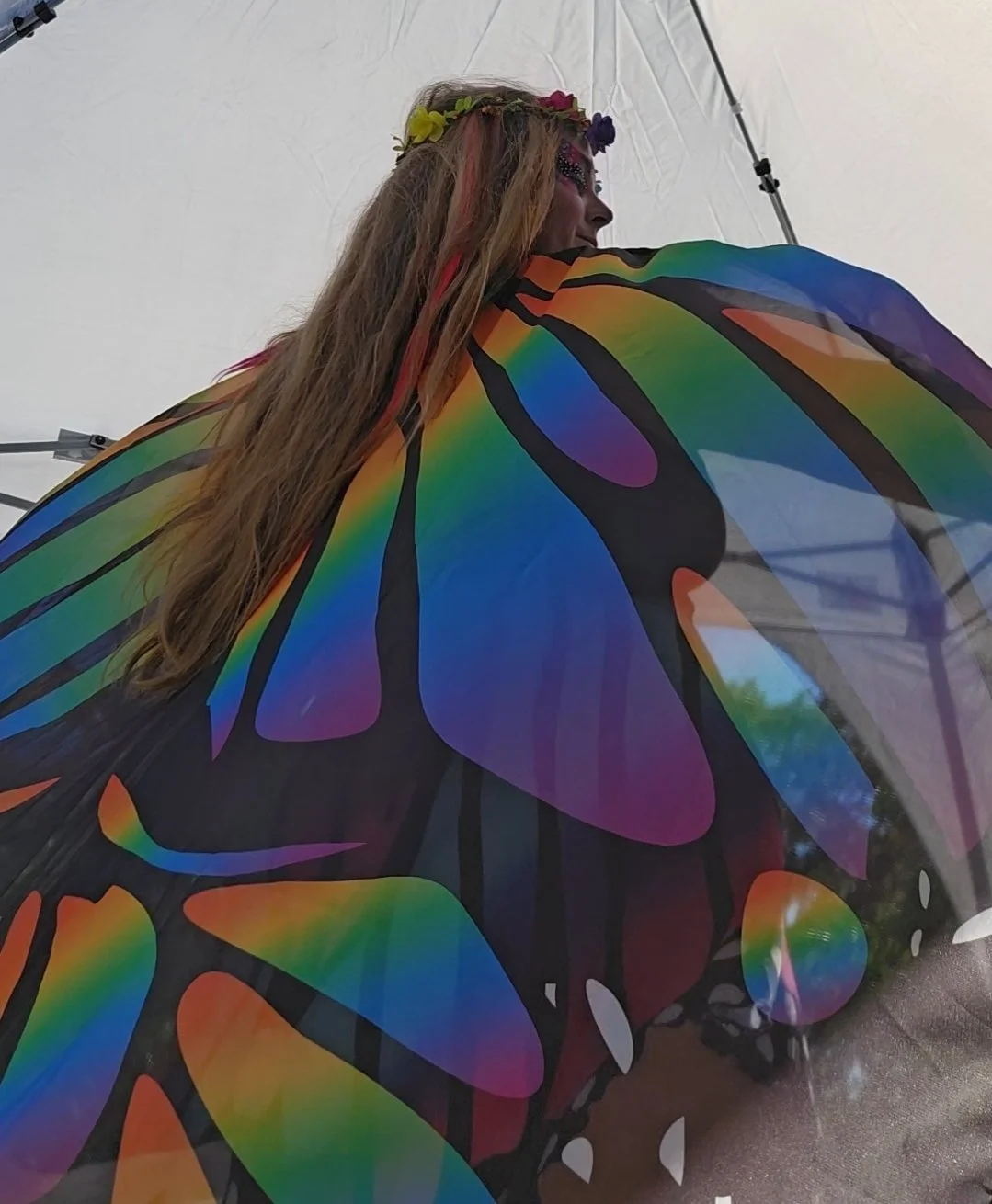 Knee length butterfly dress with bright rainbow fairy wings and a flower fairy crown!